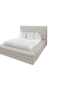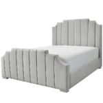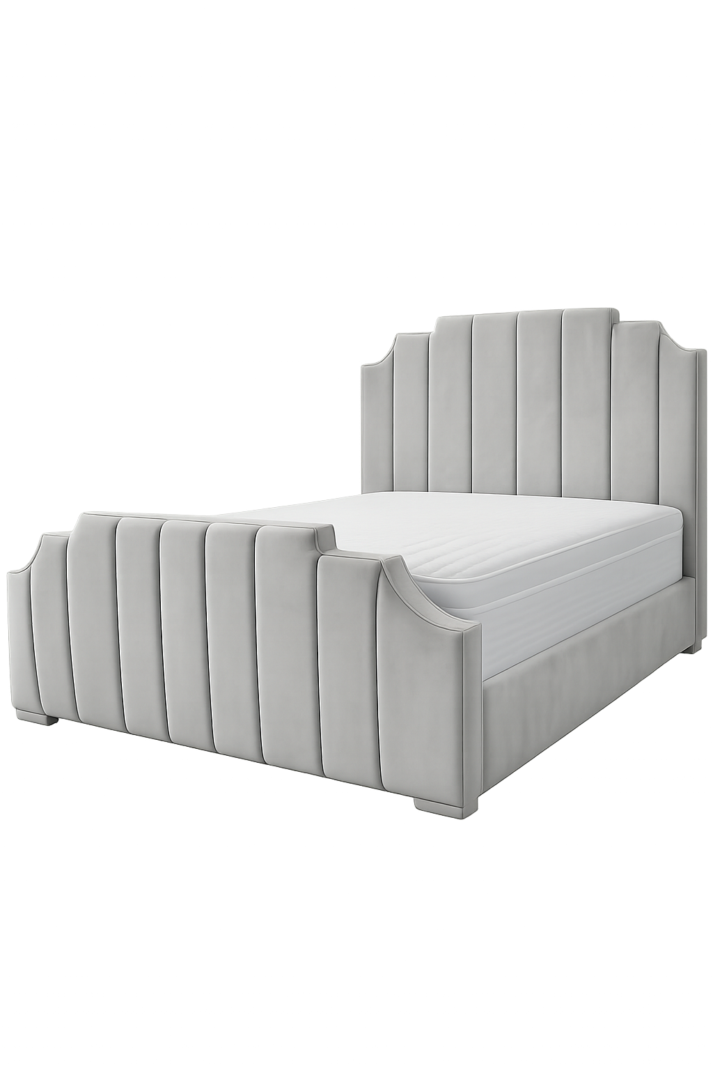 Arizona bed in soft grey velvet featuring vertical panel headboard and footboard for a modern luxury look.